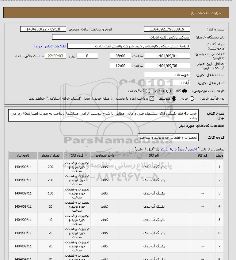 شرح کلی نیاز: خرید 45 قلم پکینگ/ ارائه پیشنهاد فنی و مالی مطابق با شرح پیوست الزامی میباشد/ پرداخت به صورت اعتباری45 روز می باشد