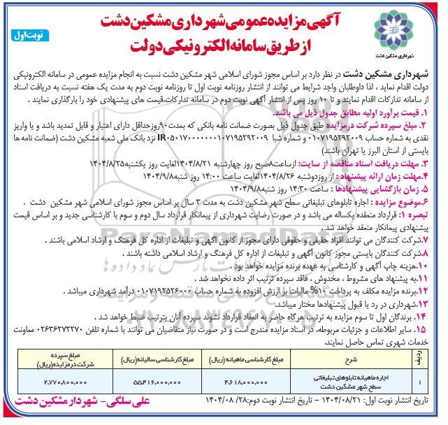 شهرداری مشکین دشت در نظر دارد بر اساس مجوز شورای اسلامی شهر مشکین دشت نسبت به انجام مزایده عمومی در سامانه الکترونیکی دولت اقدام نماید ، لذا داوطلبان واجد شرایط میتوانند از انتشار روزنامه نوبت اول تا روزنامه نوبت دوم به مدت یک هفته نسبت به دریافت اسناد از سامانه تدارکات اقدام نمایند و تا 10 روز پس از انتشار آگهی نوبت دوم در سامانه تدارکات قیمت های پیشنهادی خود را بارگذاری نمایند .