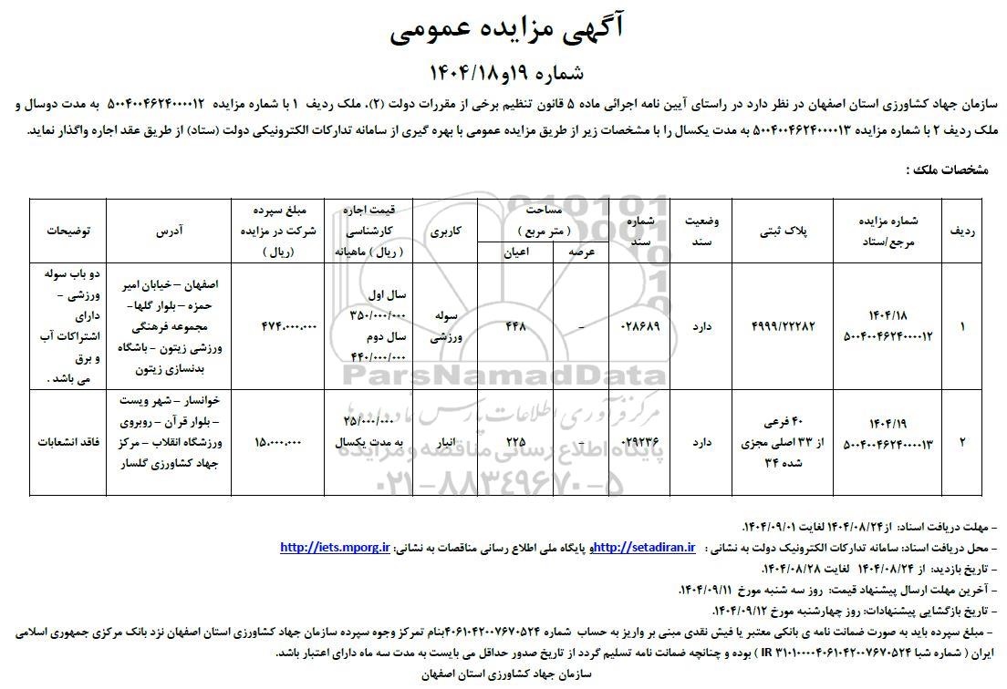 سازمان جهاد کشاورزی استان اصفهان در نظر دارد در راستای آیین نامه اجرائی ماده 5 قانون تنظیم برخی از مقررات دولت (2) ملک ردیف 1 با شماره مزایده 5004004624000012 به مدت دوسال و ملک ردیف 2 با شماره مزایده 5004004624000013 به مدت یکسال را با مشخصات زیر از طریق مزایده عمومی با بهره گیری از سامانه تدارکات الکترونیکی دولت ستاد از طریق عقد اجاره واگذار نماید.
