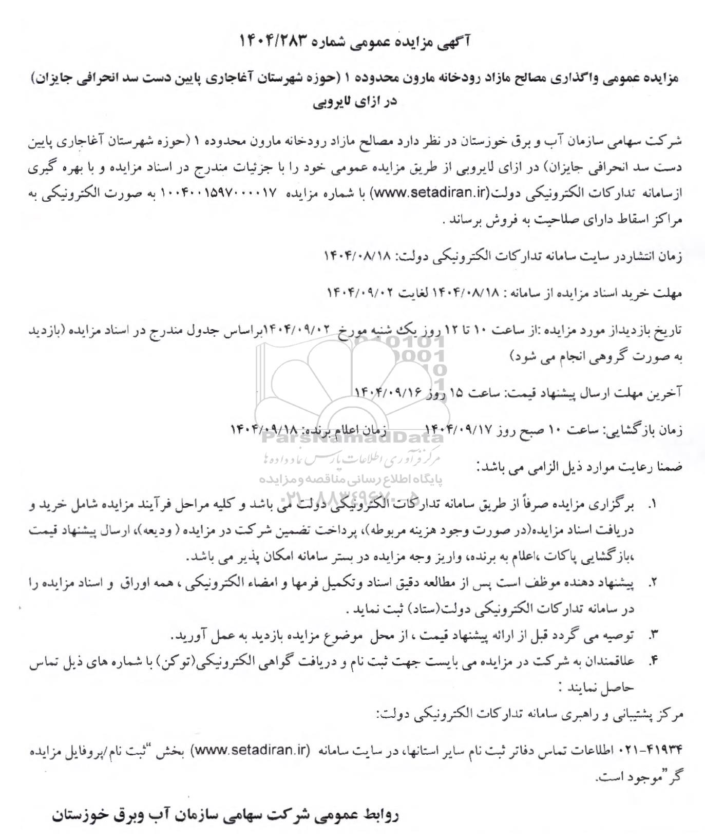 شرکت سهامی سازمان آب و برق خوزستان در نظر دارد مصالح مازاد رودخانه مارون محدوده 1 (حوزه شهرستان آغاجاری پایین دست سد انحرافی جایزان) در ازای لایروبی از طریق مزایده عمومی خود را با جزئیات مندرج در اسناد مزایده و با بهره گیری از سامانه تدارکات الکترونیکی دولت (ستاد ایران) با شماره مزایده 1004001597000017 به صورت الکترونیکی به مراکز اسقاط دارای صلاحیت به فروش برساند .