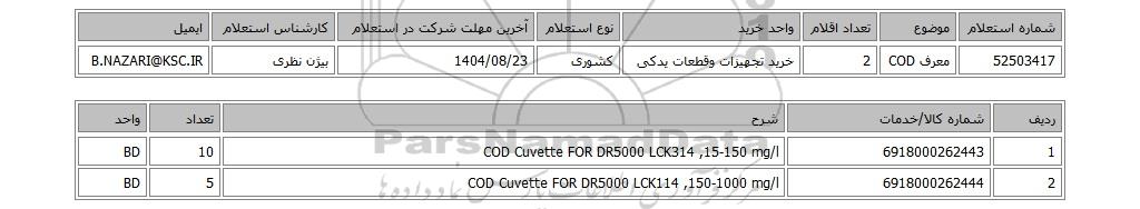 | 52503417 | معرف COD | 2 | خرید تجهیزات وقطعات یدکی | کشوری | 1404/08/23 | بیژن نظری | B.NAZARI@KSC.IR |