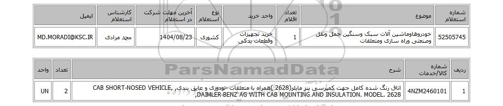 | 52505745 | خودروهاوماشین آلات سبک وسنگین حمل ونقل وصنعتی وراه سازی ومتعلقات | 1 | خرید تجهیزات وقطعات یدکی | کشوری | 1404/08/23 | محمد مرادی | MD.MORADI@KSC.IR |