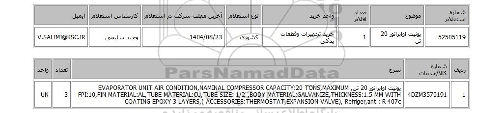 | 52505119 | یونیت اواپراتور 20 تن | 1 | خرید تجهیزات وقطعات یدکی | کشوری | 1404/08/23 | وحید سلیمی | V.SALIMI@KSC.IR |