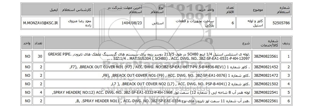 | 52505786 | کاور و لوله استیل | 6 | ساخت تجهیزات و قطعات یدکی | استانی | 1404/08/23 | محمد رضا منزوی زاده | M.MONZAVI@KSC.IR |