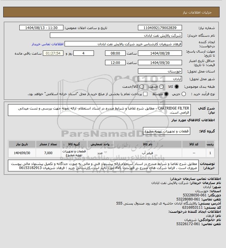 شرح کلی نیاز: CARTRIDGE FILTER - مطابق شرح تقاضا و شرایط مندرج در اسناد استعلام- ارائه نمونه جهت بررسی و تست میدانی الزامی است.