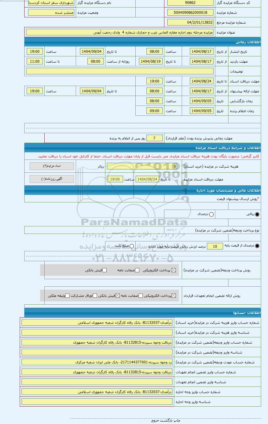 | شماره مورد اجاره | 5104090862000139 | نوع برگزاری مزایده | مزایده عمومی | |