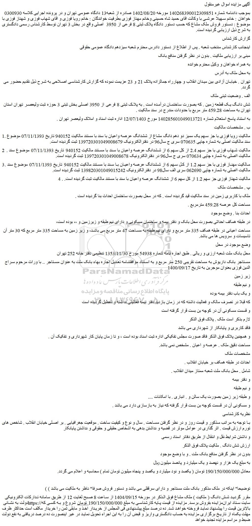 بموجب دادنامه شماره 140268390012309851 مورخه 1402/08/20 صادره از شعبه13 دادگاه عمومی تهران و در پرونده اجرایی کلاسه 0300930 خواهان : خانم سهیلا عرشی با وکالت اقای حمید شاه حسینی وخانم مهناز فوزی بطرفیت خواندگان : خانم رویا فوزی و اقای شهاب فوزی و شهناز فوزی با موضوع : دستور فروش ملک مشاع که حسب دستور دادگاه پلاک ثبتی 8 فرعی از 3950 اصلی واقع در بخش 3 تهران توسط کارشناس رسمی دادگستری به شرح ذیل ارزیابی گردیده است.