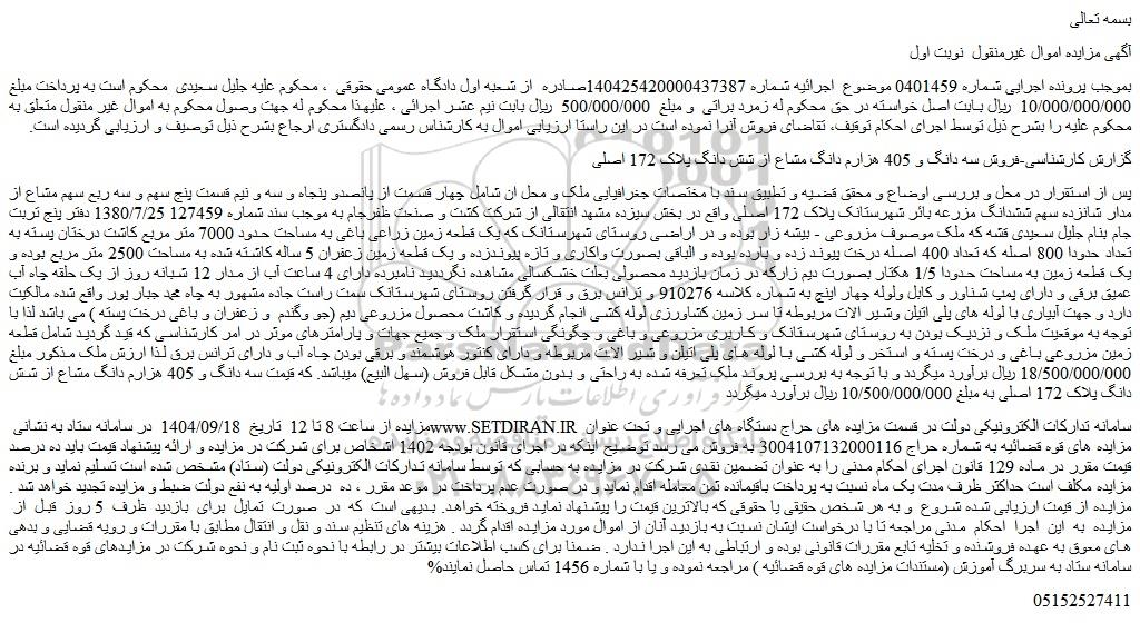 مزایده فروش سه دانگ و 405 هزارم دانگ مشاع از شش دانگ پلاک 172 اصلی, مزایده فروش سه دانگ و 405 هزارم دانگ مشاع از شش دانگ پلاک 172 اصلی