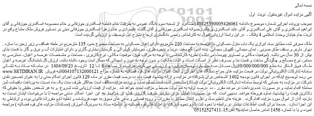 مزایده یک باب منزل مسکونی با عرصه به مساحت 220 مترمربع دارای اعیان مسکونی, مزایده یک باب منزل مسکونی با عرصه به مساحت 220 مترمربع دارای اعیان مسکونی