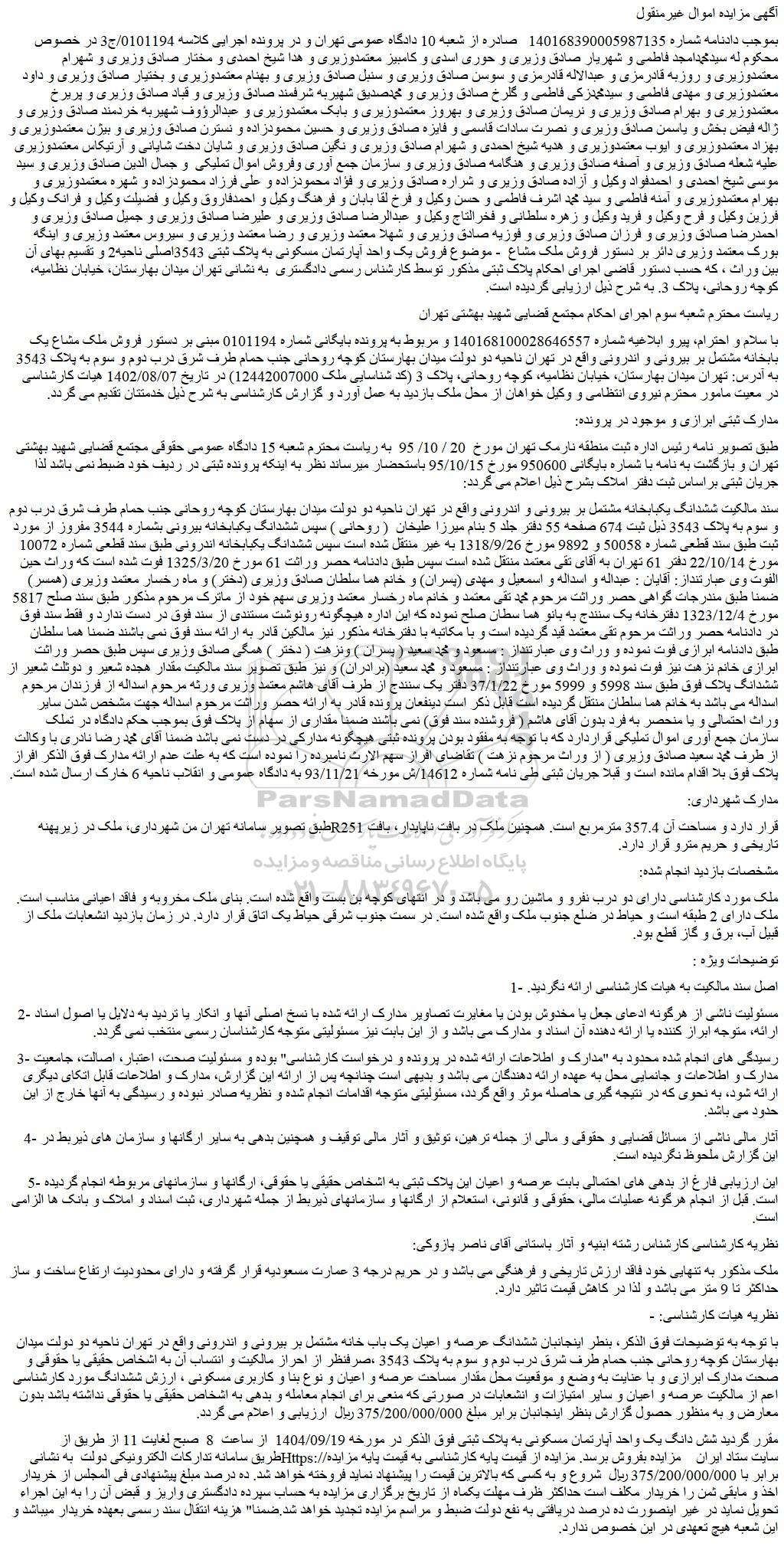بموجب دادنامه شماره 140168390005987135 صادره از شعبه 10 دادگاه عمومی تهران و در پرونده اجرایی کلاسه 0101194/ج3 در خصوص محکوم له سیدمحمدامجد فاطمی و شهریار صادق وزیری و حوری اسدی و کامبیز معتمدوزیری و هدا شیخ احمدی و مختار صادق وزیری و شهرام معتمدوزیری و روزبه قادرمزی و عبدالاله قادرمزی و سوسن صادق وزیری و سنبل صادق وزیری و بهنام معتمدوزیری و بختیار صادق وزیری و داود معتمدوزیری و مهدی فاطمی و سیدمحمدزکی فاطمی و گلرخ صادق وزیری و محمدصدیق شهیربه شرفمند صادق وزیری و قباد صادق وزیری و پریرخ معتمدوزیری و بهرام صادق وزیری و نریمان صادق وزیری و بهروز معتمدوزیری و بابک معتمدوزیری و عبدالرؤوف شهیربه خردمند صادق وزیری و ژاله فیض بخش و یاسمن صادق وزیری و نصرت سادات قاسمی و فایزه صادق وزیری و حسین محمودزاده و نسترن صادق وزیری و بیژن معتمدوزیری و بهزاد معتمدوزیری و ایوب معتمدوزیری و هدیه شیخ احمدی و شهرام صادق وزیری و نگین صادق وزیری و شایان دخت شایانی و آرتیکاس معتمدوزیری علیه شعله صادق وزیری و آصفه صادق وزیری و هنگامه صادق وزیری و سازمان جمع آوری وفروش اموال تملیکی و جمال الدین صادق وزیری و سید موسی شیخ احمدی و احمدفواد وکیل و آزاده صادق وزیری و شراره صادق وزیری و فؤاد محمودزاده و علی فرزاد محمودزاده و شهره معتمدوزیری و بهرام معتمدوزیری و آمنه فاطمی و سید محمد اشرف فاطمی و حسن وکیل و فرخ لقا بابان و فرهنگ وکیل و احمدفاروق وکیل و فضیلت وکیل و فرانک وکیل و فرزین وکیل و فرح وکیل و فرید وکیل و زهره سلطانی و فخرالتاج وکیل و عبدالرضا صادق وزیری و علیرضا صادق وزیری و جمیل صادق وزیری و احمدرضا صادق وزیری و فرزان صادق وزیری و فوزیه صادق وزیری و شهلا معتمد وزیری و رضا معتمد وزیری و سیروس معتمد وزیری و اینگه بورک معتمد وزیری دائر بر دستور فروش ملک مشاع - موضوع فروش یک واحد آپارتمان مسکونی به پلاک ثبتی 3543اصلی ناحیه2 و تقسیم بهای آن بین وراث ، که حسب دستور قاضی اجرای احکام پلاک ثبتی مذکور توسط کارشناس رسمی دادگستری به نشانی تهران میدان بهارستان، خیابان نظامیه، کوچه روحانی، پلاک 3. به شرح ذیل ارزیابی گردیده است.