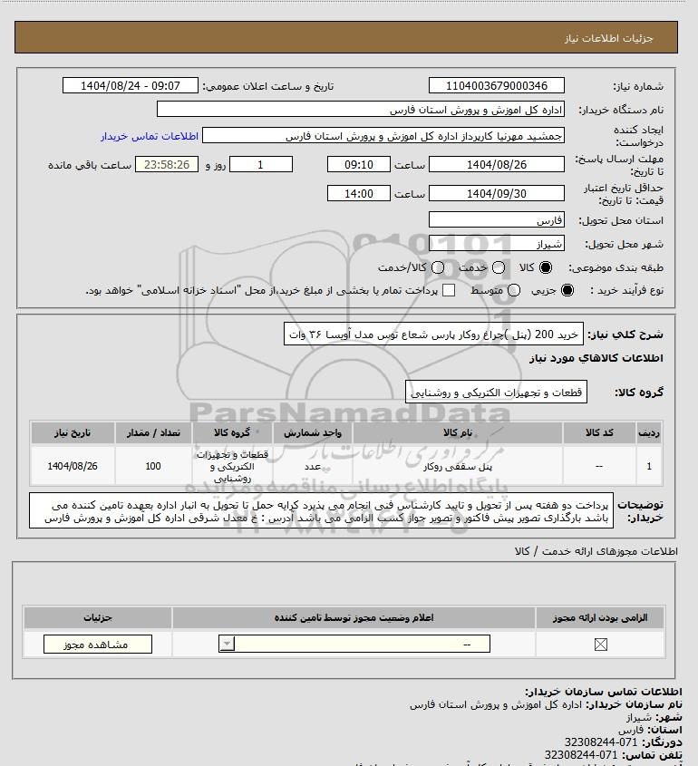 شرح کلی نیاز: خرید 200 (پنل )چراغ روکار پارس شعاع توس مدل آویسا ۳۶ وات