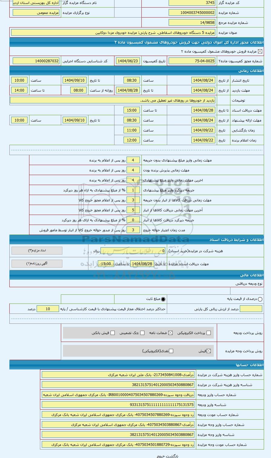 | عنوان مزایده | مزایده 5 دستگاه خودروهای اسقاطی | |||