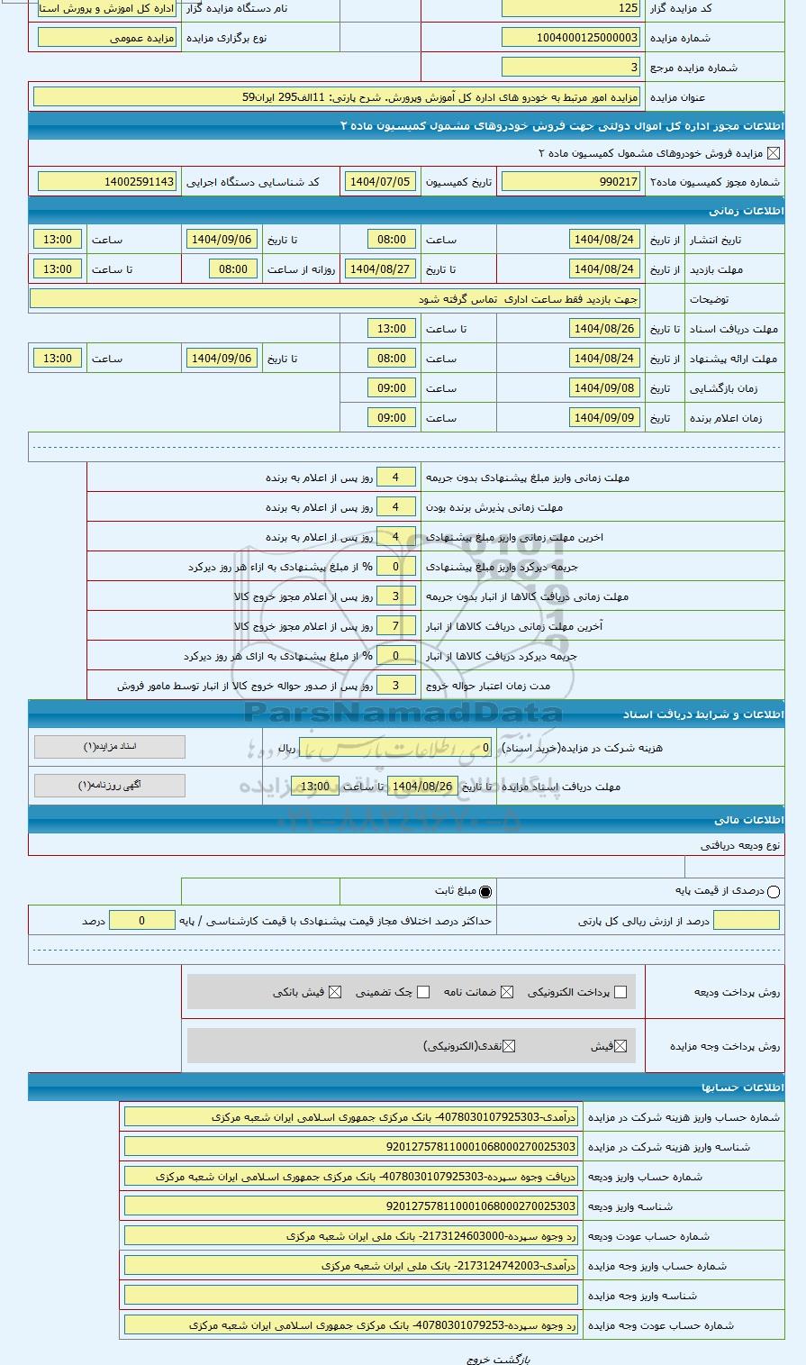 | عنوان مزایده | مزایده امور مرتبط به خودرو های اداره کل آموزش وپرورش | |||