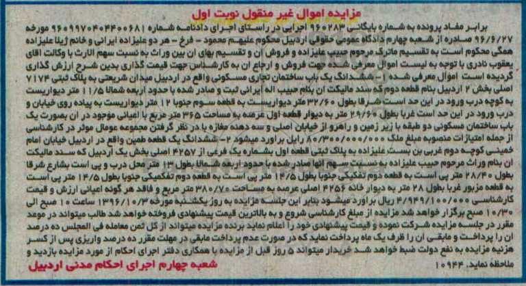 مزایده ششدانگ ساختمان و باغ نوبت اول غیرمنقول کلاسه 960283
