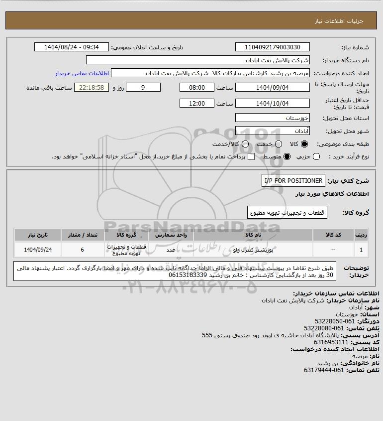 شرح کلی نیاز: I/P FOR POSITIONER