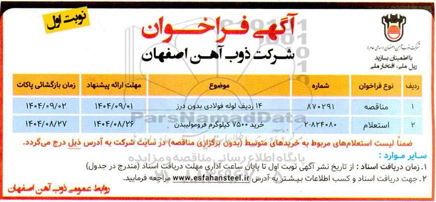 | 1 | مناقصه | 870291 | 14 ردیف لوله فولادی بدون درز | 1404.09.01 | 1404.09.02 |