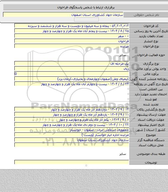 مزایده عمومی مزایده مزایده اجاره انبار خوانسار (ویست ) برگزار میگردد. از کلیه افراد متخصص و شرکتهای واجد شرایط دعوت به عمل میآید تا در این مزایده با کد خبرگزاری پارس نماد : 9850007 شرکت نمایند تاریخ شروع مزایده : 1404/08/24 مهلت شرکت در مزایده: تا پایان روز 1404/09/01 مکان برگزاری اموال واگذاری استانهای مزایدات استان اصفهان و دستهبندیهای مربوط به این حراجی واگذاری ورزشگاه، پارکینگ، غرفه و بوفه میباشد.