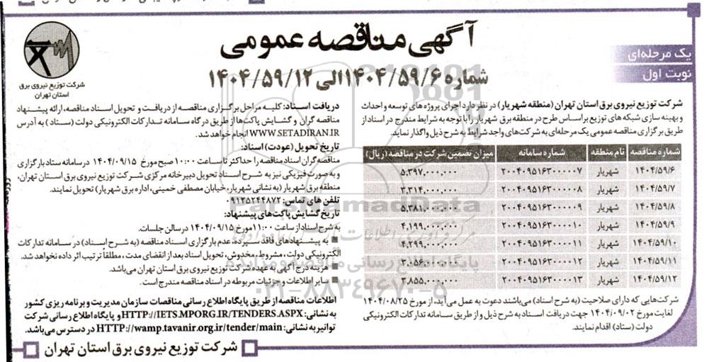 شرکت توزیع نیروی برق استان تهران منطقه برق شهر شهریار در نظر دارد اجرای پروژه های توسعه احداث و بهینه سازی شبکه های توزیع بر اساس طرح در سطح منطقه برق شهر قدس را با توجه به شرایط مندرج در اسناد از طریق برگزاری مناقصه عمومی یک مرحله ای به شرکتهای واجد شرایط به شرح ذیل واگذار نماید.