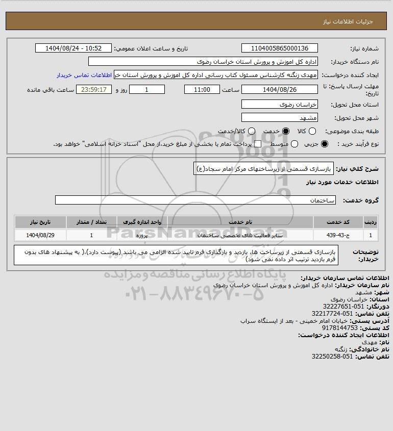 توضیحات خریدار:بازسازی قسمتی از زیرساخت ها، بازدید و بارگذاری فرم تایید شده الزامی می باشد (پیوست دارد)،( به پیشنهاد های بدون فرم بازدید ترتیب اثر داده نمی شود)