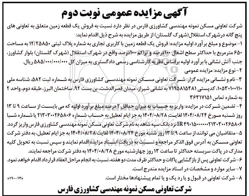 شرکت تعاونی مسکن نمونه مهندسی کشاورزی فارس در نظر دارد نسبت به فروش یک قطعه زمین متعلق به تعاونی های پنج گانه در شهرک استقلال (شهرک گلستان) از طریق مزایده به شرح ذیل اقدام نماید