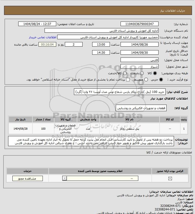 شرح کلی نیاز: خرید 100 (پنل )چراغ روکار پارس شعاع توس مدل آویسا ۳۶ وات (گرد)