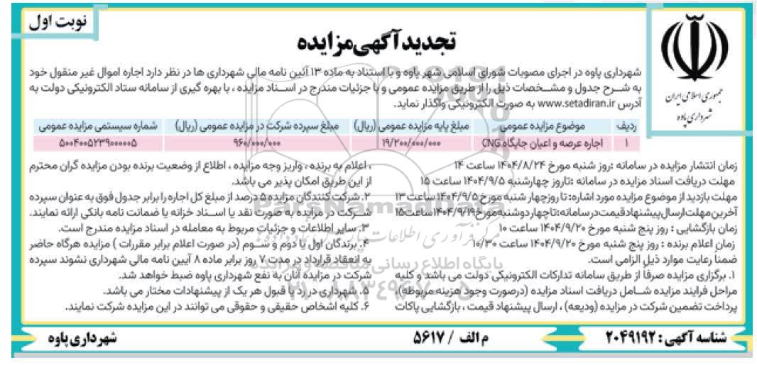 مزایده عمومی تجدید مزایده اجاره عرصه و اعیان جایگاه CNG -مزایده روزشنبه بیست و چهارم آبان ماه 1404 برگزار میگردد. از کلیه افراد متخصص و شرکتهای واجد شرایط دعوت به عمل میآید تا در این مزایده با کد خبرگزاری پارس نماد : 9852155 شرکت نمایند تاریخ شروع مزایده : 1404/08/24 مهلت شرکت در مزایده: تا پایان روز 1404/09/05 مکان برگزاری اموال واگذاری استانهای کرمانشاه و دستهبندیهای مربوط به این حراجی جایگاه سوخت میباشد.