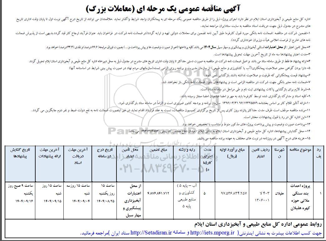 اداره کل منابع طبیعی و آبخیزداری استان ایلام در نظر دارد اجرای پروژه ذیل را از طریق مناقصه عمومی یک مرحله ای به پیمانکاران واجد شرایط واگذار نماید علاقمندان می توانند از تاریخ درج آگهی نوبت اول تا پایان وقت اداری تاریخ های مندرج در جدول ذیل جهت دریافت استاد مناقصه به سایت ستاد ایران مراجعه نمایند.
