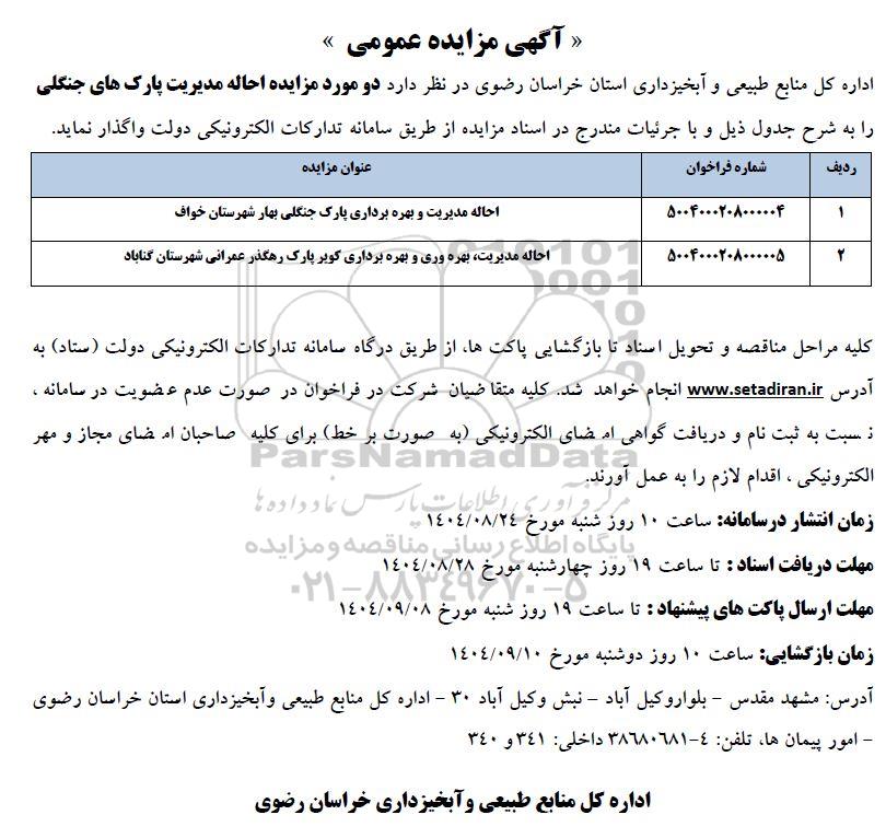 اداره کل منابع طبیعی و آبخیزداری استان خراسان رضوی در نظر دارد دو مورد مزایده احاله مدیریت پارک های جنگلی را به شرح جدول ذیل و با جرئیات مندرج در اسنادمزایده از طریق سامانه تدارکات الکترونیکی دولت واگذار نماید.