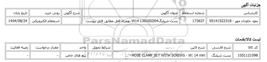| محمد جاودان مهر - 05141522318 | 173637 | بست شیلنگW14 L30AISI304 بهمراه قفل مطابق فایل پیوست | استعلام الکترونیکی | 1404/08/24 |
