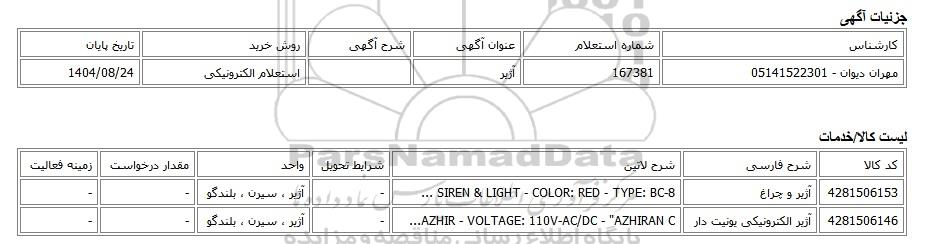 | مهران دیوان - 05141522301 | 167381 | آژیر | استعلام الکترونیکی | 1404/08/24 |