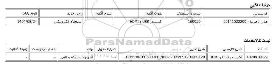 | علی ناصرنیا - 05141522299 | 169959 | اکستندر USB و HDMI | استعلام الکترونیکی | 1404/08/24 |