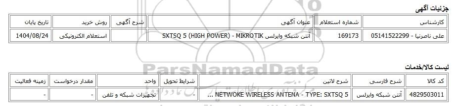 | علی ناصرنیا - 05141522299 | 169173 | آنتن شبکه وایرلس SXTSQ 5 (HIGH POWER) - MIKROTIK | استعلام الکترونیکی | 1404/08/24 |