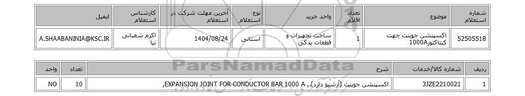| 52505518 | اکسپنشن جوینت جهت کنتاکتور1000A | 1 | ساخت تجهیزات و قطعات یدکی | استانی | 1404/08/24 | اکرم شعبانی نیا | A.SHAABANINIA@KSC.IR |