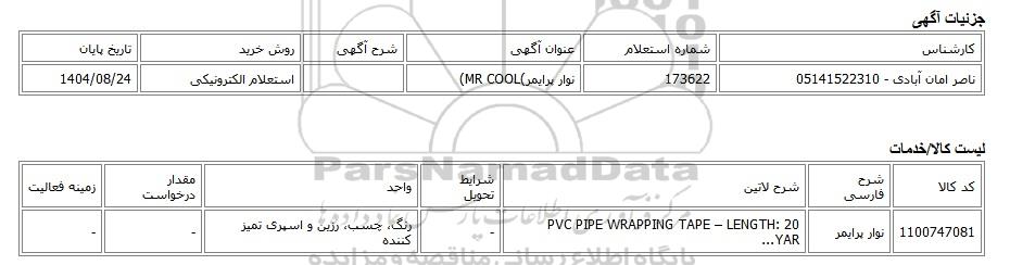 | ناصر امان آبادی - 05141522310 | 173622 | نوار پرایمر)MR COOL) | استعلام الکترونیکی | 1404/08/24 |