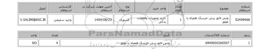 | 52499466 | ونتی لاتور برش خرسک همراه با موتور | 1 | خرید تجهیزات وقطعات یدکی | کشوری | 1404/08/23 | وحید سلیمی | V.SALIMI@KSC.IR |