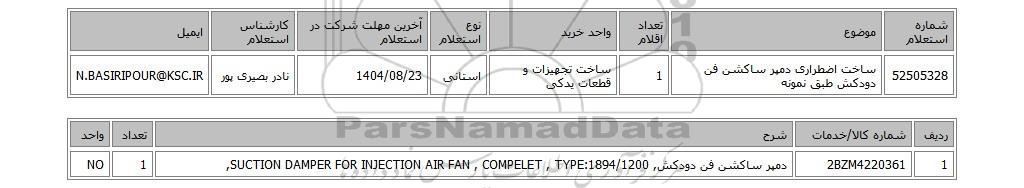 | 52505328 | ساخت اضطراری دمپر ساکشن فن دودکش طبق نمونه | 1 | ساخت تجهیزات و قطعات یدکی | استانی | 1404/08/23 | نادر بصیری پور | N.BASIRIPOUR@KSC.IR |