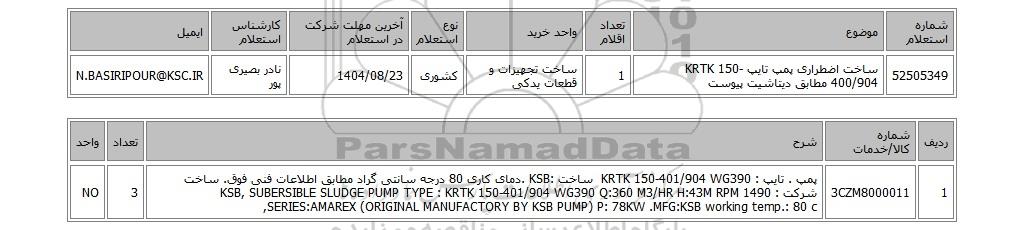 | 52505349 | ساخت اضطراری پمپ تایپ KRTK 150-400/904 مطابق دیتاشیت پیوست | 1 | ساخت تجهیزات و قطعات یدکی | کشوری | 1404/08/23 | نادر بصیری پور | N.BASIRIPOUR@KSC.IR |