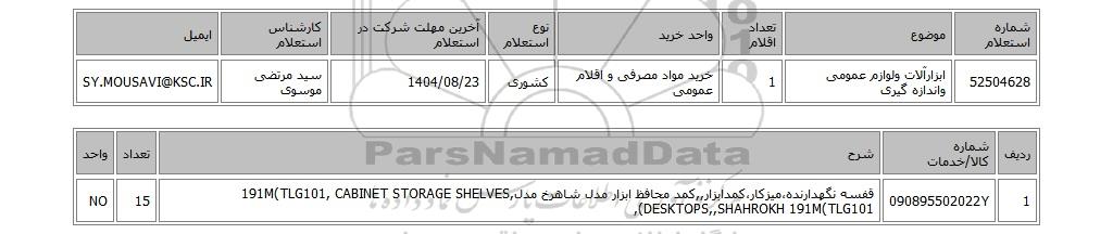 | 52504628 | ابزارآلات ولوازم عمومی واندازه گیری | 1 | خرید مواد مصرفی و اقلام عمومی | کشوری | 1404/08/23 | سید مرتضی موسوی | SY.MOUSAVI@KSC.IR |