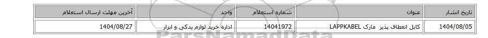 | 1404/08/05 | کابل انعطاف پذیر مارک LAPPKABEL | 14041972 | اداره خرید لوازم یدکی و ابزار | 1404/08/27 |