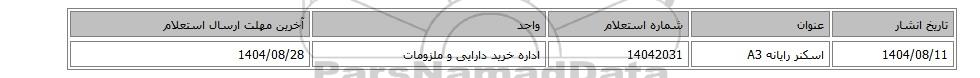 | 1404/08/11 | اسکنر رایانه A3 | 14042031 | اداره خرید دارایی و ملزومات | 1404/08/28 |