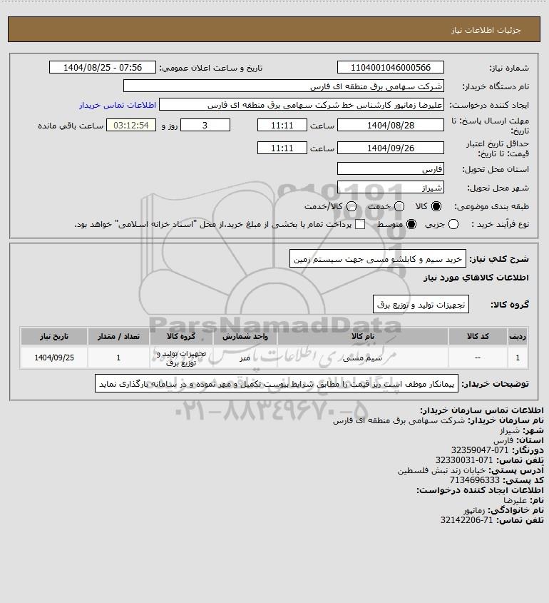 شرح کلی نیاز: خرید سیم و کابلشو مسی جهت سیستم زمین
