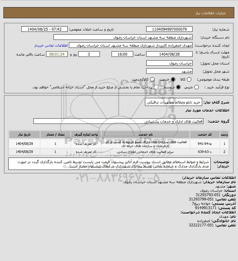 شرح کلی نیاز: خرید تابلو وعلائم وتجهیزات ترافیکی