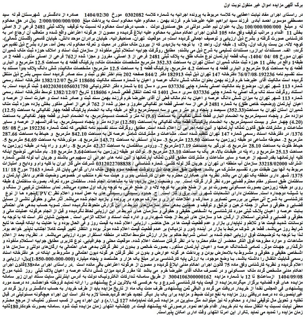 در راستای اجرای مفاد نیابت اعطایی به کلاسه مربوط به پرونده اجرائیه به شماره کلاسه 0302082  مورخ  1404/02/30    صادره از دادگستری  شهرستان قم له  سید مصطفی موسوی احمد آبادی  فرزند سید ابراهیم علیه علیرضا خرم  فرزند بهمن ، محکوم علیه محکوم است به پرداخت مبلغ  2/000/000/000/000  ریال در حق محکوم له  و مبلغ  100/000/000/000 ریال به عنوان نیم عشر دولتی در حق صندوق دولت  ، حسب درخواست محکوم له نسبت به توقیف  پلاک ثبتی 2481 فرعی از 3 اصلی بخش 11  اقدام و مراتب توقیف وفق ماده 105 قانون اجرای احکام مدنی به محکوم علیه ابلاغ گردیده و مصون از هرگونه اعتراض واقع شده و متعاقب آن ارجاع امر به کارشناس صورت گرفته و بشرح ذیل ارزیابی و توصیف اجمالی گردیده است: در موقعیت  تهران، صاحبقرانیه، خیابان برادران موحد دانش، خیابان قاسمی (گلستان شمالی)، کوچه لاله، بن بست پارک اول، پلاک 1، طبقه اول، واحد 2؛  با توجه به بازدیدی که از بیرون ملک مذکور در معیت و تعرفه محکوم له، بعمل آمد، موارد بشرح ذیل تقدیم می گردد:  الف- مستندات ابرازی: مستندات تسلیمی به شرح ذیل می باشند:  مطابق روگرفت جوابیه استعلام ثبتی مأخوذه از سازمان ثبت اسناد و املاک حوزه ثبت ملک شمیران تهران مورخ 08 /04 /1404، یک قطعه آپارتمان نوع ملک طلق به پلاک ثبتی 2481 فرعی از 3 اصلی، مفروز و مجزا شده از762 فرعی از اصلی مذکور، قطعه 2 در طبقه1 واقع در بخش 11 حوزه ثبت ملک شمیران استان تهران به مساحت 352.33 مترمربع مشخصات منضمات ملک: پارکینگ قطعه 4 به مساحت 12.5 مترمربع و انباری قطعه 6 به مساحت 9.6 مترمربع و انباری قطعه 4 به مساحت 4.2 مترمربع، پارکینگ قطعه 1 به مساحت 12.5 مترمربع؛ مشخصات مالکیت: شش دانگ پلاک بدواً مستند به سند تقسیم نامه 192236-76/07/08 دفترخانه 147 تهران ذیل ثبت 182913 دفتر 844/2 صفحه 202 بنام اختر نقوی ثبت و سند صادر گردیده است سپس بشرح ذیل منتقل گردیده است مالکیت آقای علیرضا خرم فرزند بهمن بعنوان مالک شش دانگ عرصه و اعیان با شماره مستند مالکیت 118606 تاریخ 1382/12/07 دفترخانه اسناد رسمی شماره 113 شهر تهران، موضوع بند مالکیت اصلی بشماره چاپی 037336 سری ه سال 01 با شماره دفتر الکترونیکی 140220301056031750 ثبت گردیده است. به استناد روگرفت سند تک برگ اصلی به شماره چاپی 037336 سری ه-سال 1401 که تحت انتقال قطعی شماره 118606 تاریخ 1382/12/07 توسط دفترخانه اسناد رسمی شماره 113 شهر تهران به میزان شش دانگ عرصه و اعیان به نام مالک فعلی آن آقای علیرضا خرم فرزند بهمن سند ثبت و صادر شده است و عبارت است از عرصه و اعیان آپارتمان (وضعیت خاص طلق) به شماره 2481 فرعی از سه اصلی قطعه دو تفکیکی مفروز و مجزی شده از 762 فرعی از اصلی مذکور بخش یازده حوزه ثبت ملک شمیران استان تهران به مساحت(352.33) سیصد و پنجاه و دو متر و سی و سه دسیمترمربع واقع در طبقه یک به انضمام پارکینگ قطعه چهار تفکیکی به مساحت (12.5) دوازده متر و پنجاه دسیمترمربع به انضمام انباری قطعه شش تفکیکی به مساحت (9.6) نه متر و شصت دسیمترمربع، به انضمام انباری قطعه چهار تفکیکی به مساحت (4.20) چهار متر و بیست دسیمترمربع، به انضمام پارکینگ قطعه یک تفکیکی به مساحت (12.50) دوازده متر و پنجاه دسیمترمربع، با قدرالسهم از عرصه و سایر مشاعات و مشترکات طبق قانون تملّک آپارتمانها و آئین نامه اجرایی آن اعلام شده است. مطابق روگرفت سند تقسیم نامه تنظیمی که تحت شماره 192236 مورخ 08 /05 /1376 در دفترخانه اسناد رسمی شماره 147 تهران تنظیم شده است، مشاعات و مشترکات شامل عرصه کل به مساحت 842.10 مترمربع  و حیاط به مساحت 287.66 مترمربع 2- محوطه مشاعی دو طبقه زیرزمین به مساحت 123.50 مترمربع 3- سونا و استخر به مساحت 143.71 مترمربع 4- موتورخانه به مساحت 54.69 مترمربع 5- حیاط خلوت به مساحت 28.10 مترمربع 6- نورگیر به مساحت 17.19مترمربع 7- ورودی ساختمان به مساحت 42.37 مترمربع 8- راهرو و راه پله در طبقه زیرزمین به مساحت 25.13 مترمربع و راه پله در طبقات بالا هر یک به مساحت 23.10 مترمربع 9- توالت دو طبقه زیرزمین به مساحت3.64 مترمربع 10- بام مشاعی. توضیح اینکه کلیه آپارتمانها بقدرالسهم از عرصه و سایر 
