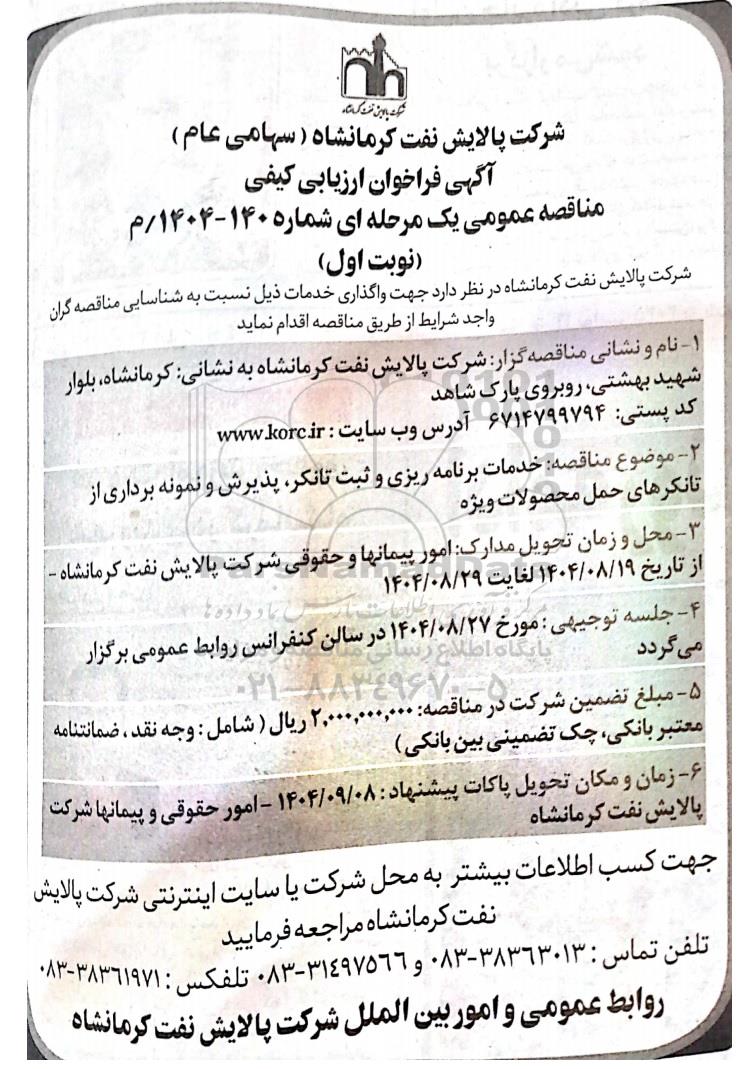 شرکت پالایش نفت کرمانشاه در نظر دارد جهت واگذاری خدمات ذیل نسبت به شناسایی مناقصه گران واجد شرایط از طریق مناقصه اقدام نماید.