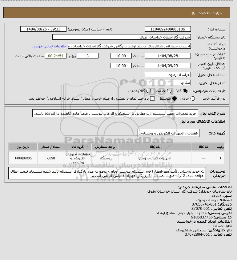 | 1 | -- | تجهیزات اتصال به زمین | دستگاه | قطعات و تجهیزات الکتریکی و روشنایی | 7,890 | 1404/09/05 |
