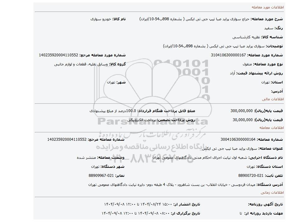 | نام دستگاه اجرایی: شعبه اول نیابت اجرای احکام مدنی دادگاههای عمومی تهران | وضعیت معامله: منتشر شده | |