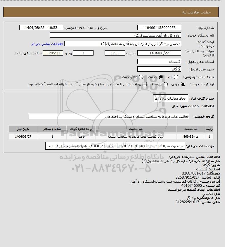 استعلام بها و موضوع استعلام استعلام انجام معاینات دوره ای به اطلاع کلیه شرکتها و افراد متخصص واجد شرایط میرساند، آگهی گذار در نظر دارد از طریق استعلام بها، نسبت به انتخاب و دریافت پیشنهادات اقدام نماید. این استعلام با کد آگهی ثبت شده در سامانه خبرگزاری پارس نماد : 9857630 منتشر شده است. مشخصات استعلام : تاریخ شروع استعلام: 1404/08/25 آخرین مهلت ارسال پیشنهاد قیمت : 1404/08/27 و محل اجرای پروژه : استان مناقصات استان گلستان میباشد. استعلام قیمت مورد درخواست : استعلام انجام معاینات دوره ای با دستهبندیهای تخصصی و گروه های مرتبط : خدمات و تجهیزات آزمایشگاهی و پزشکی, استعلام اطلاع رسانی میگردد.