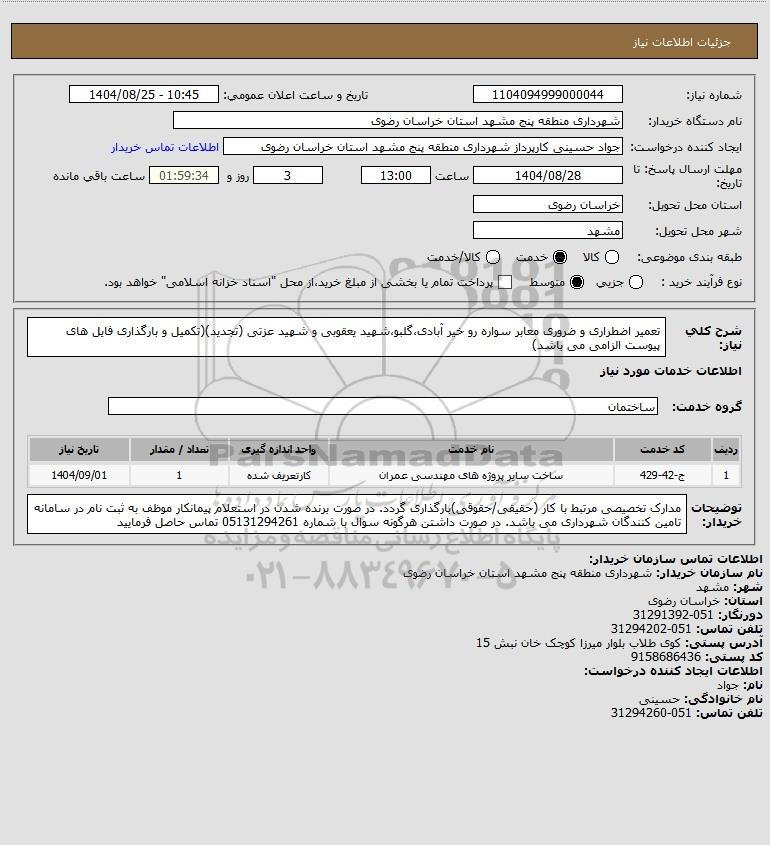 شرح کلی نیاز: تعمیر اضطراری و ضروری معابر سواره رو خیر آبادی،گلبو،شهید یعقوبی و شهید عزتی (تجدید)(تکمیل و بارگذاری فایل های پیوست الزامی می باشد)