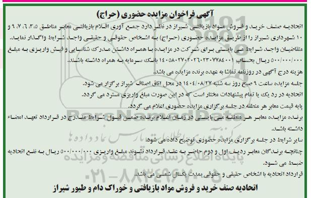 اتحادیه صنف خرید و فروش مواد بازیافتی شیراز در نظر دارد جمع آوری اقلام بازیافتی معابر مناطق  5، 3 ، 6، 7، 9 و 10 شهرداری شیراز را از طریق مزایده حضوری (حراج) به اشخاص حقوقی و حقیقی واجد شرایط واگذار نماید.