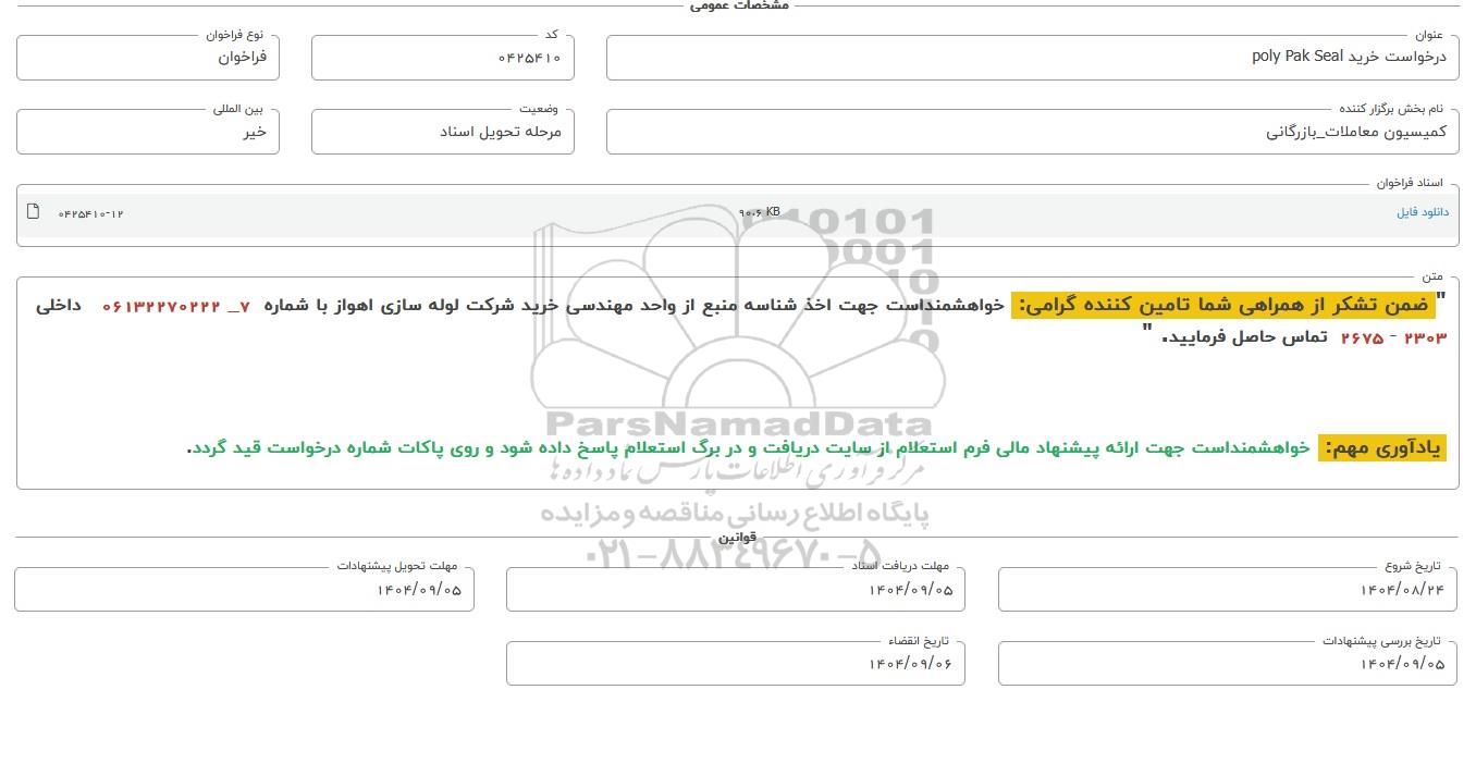 فراخوان، استعلام خرید poly pak seal -مناقصه روز یکشنبه بیست و پنجم آبان ماه 1404, فراخوان، استعلام خرید poly pak seal